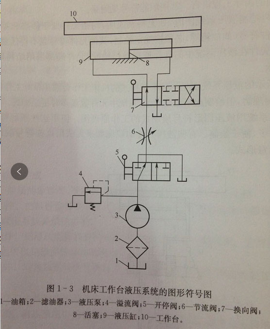 下圖所示的液壓系統(tǒng)圖是一種半結(jié)構(gòu)的機床工作臺液壓系統(tǒng)工作原理圖,它的直觀性強,容易理解,但繪制起來比較麻煩,系統(tǒng)中元件數(shù)量多時更是如此。